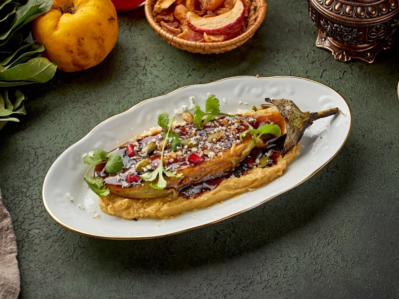 Запечёный баклажан с хумусом и гранатовым унаги