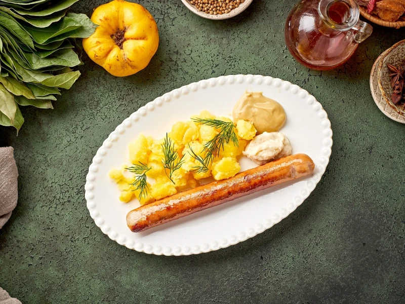 Куриная колбаска с картофелем, сливочным хреном и горчицей