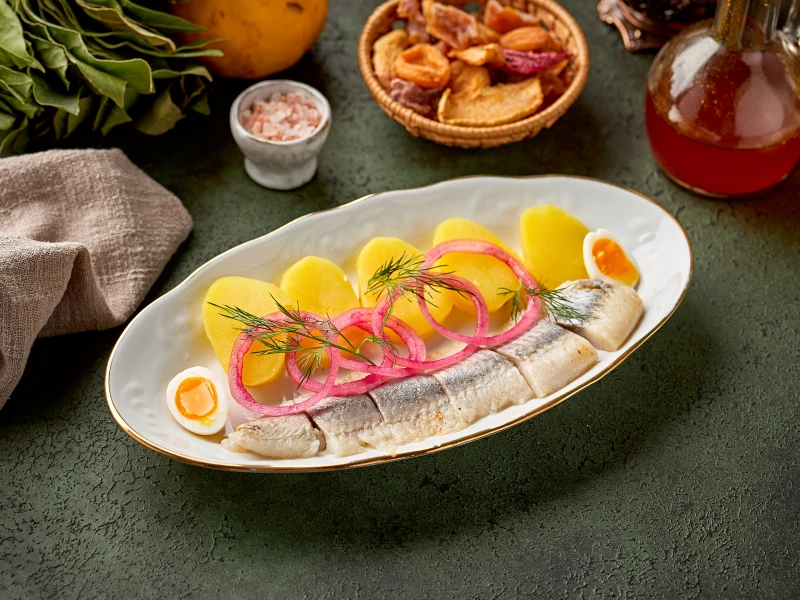 Традиционная русская закуска. Сельдь с картошкой и маринованным луком