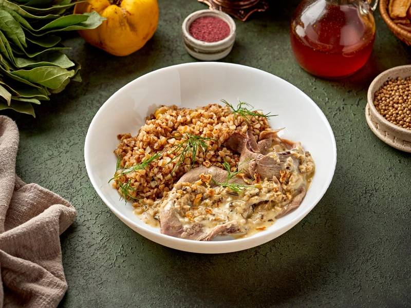 Телячий язык с гречей и грибным соусом