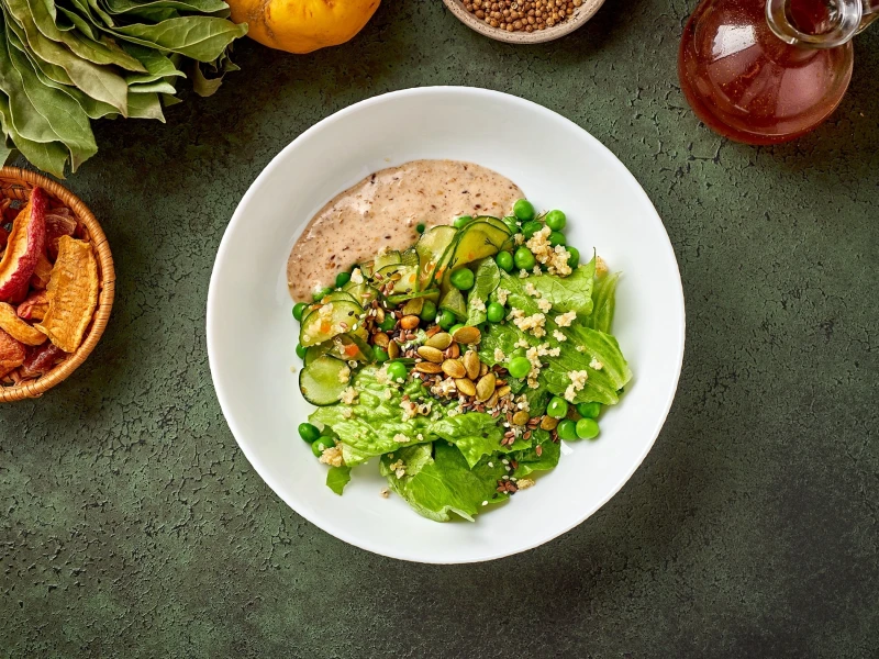 Зеленый салат с ореховым соусом