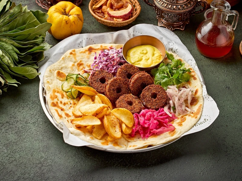 Вегетерианская версия донера. Обжаренные котлеты из нута со специями, подаем с соусом карри, овощами и картошкой фри